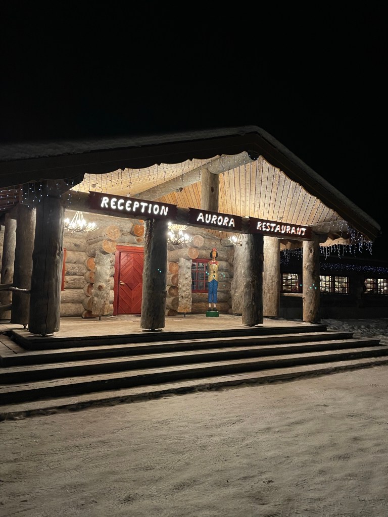 Rovaniemi itself is a small city located at the intersection of the Kemijoki and Ounasjoki Rivers. We stayed at the Scandic Pohjanhovi Hotel, which has a fantastic view of those rivers. Our room was spacious and the bed was comfortable, and we even had a little note and some candies welcoming us for our honeymoon, but if you book a room here, don’t expect luxury. The hotel could definitely use some updating (see: the Cold War-era elevator near the hotel restaurant), but it was perfectly fine for the night we were there.