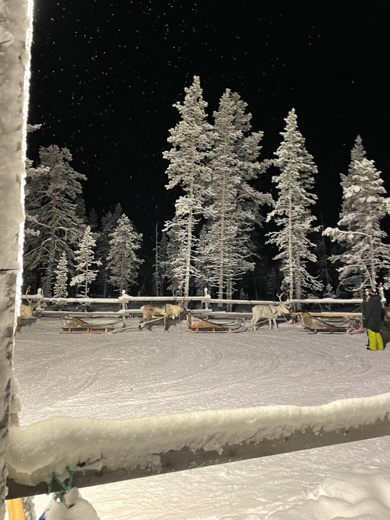 Kakslauttanen offers numerous activity options, including snowmobiling, dog sledding, snowshoeing, and reindeer sleigh rides. Our travel agent booked us an evening Reindeer Aurora Hunt, and it’s not a hard call to say it was one of the coolest experiences I’ve ever had. You are met by your reindeer guide at the lobby and taken to the gear room to make sure you’re properly outfitted for the cold (please do not use this as your sign to not bring boots and a winter coat — you will regret it). After making sure everyone had hats, gloves, and coveralls as needed, we were given a quick safety briefing and then taken to meet the reindeer. Each duo is assigned to your own sleigh, so be aware that if there are an odd number in your group, someone is likely going to have to ride with a stranger.