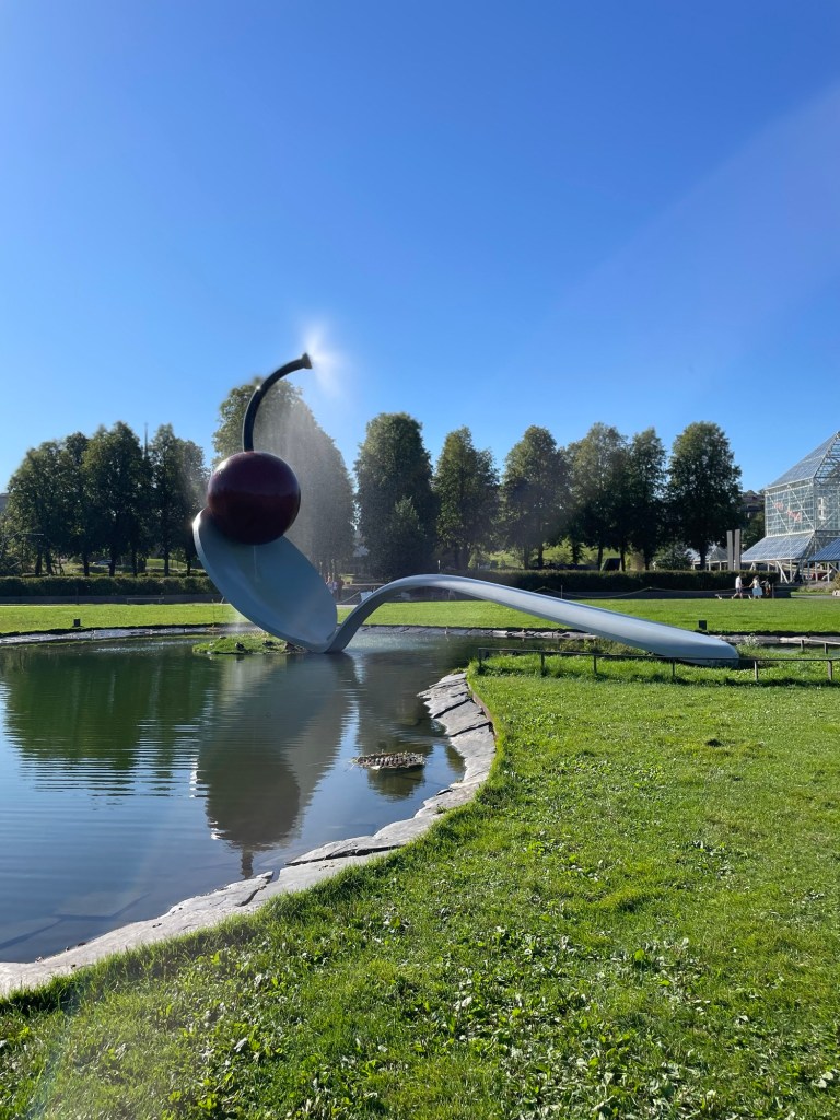 Saturday was our day of exploration. We started by walking to the Rustica bakery for coffee and breakfast sammies. I got a bacon, egg, and cheese on brioche and a hazelnut latte — definitely recommend both. From there, we headed over to the Sculpture Garden at the Walker Art Center. The Sculpture Garden, which is free and open from 6am to midnight every day, is wonderful. We spent an hour or so just wondering from installation to installation. There are clean bathrooms available, and there was a food truck set up while we were there as well.