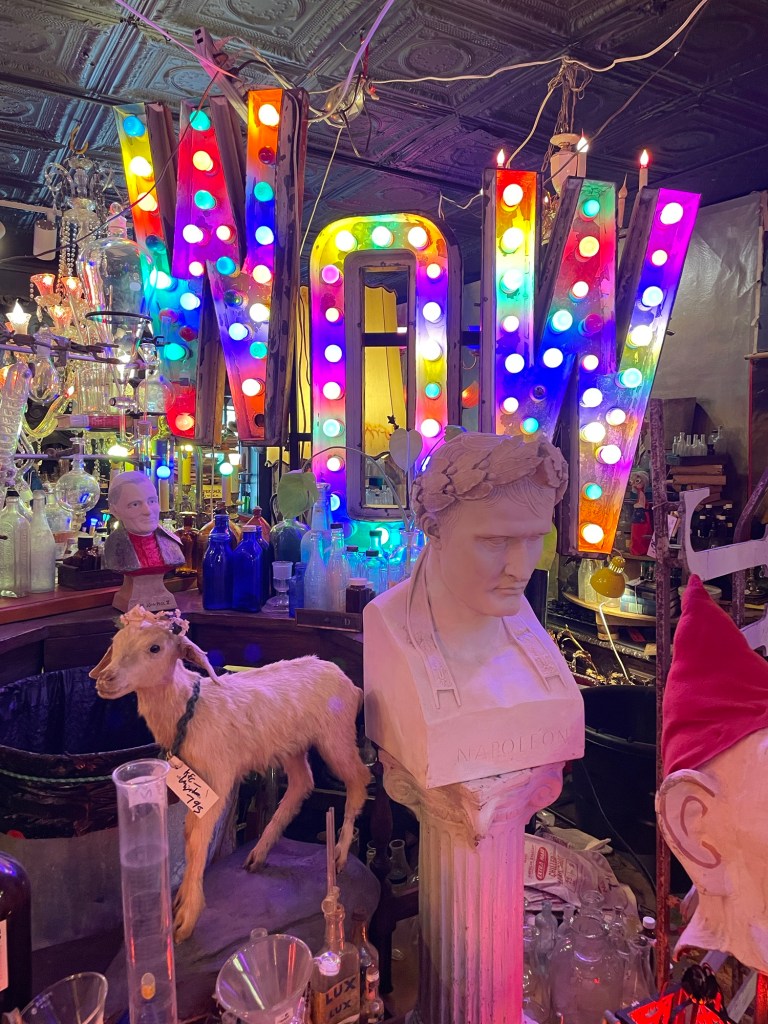 Next up was a trip to Hunt and Gather, which is an absolute wonderland of vintage furniture, art, clothes, and basically any kind of tchotchke you can imagine. Husband is not one for aimless browsing, but even his interest was piqued by this treasure trove of a store. I probably could have spent all day perusing their various goods — everything from chandeliers to vintage Playboy magazines to neon signage and throw pillows. If we hadn’t been carrying on only, I probably would have done more damage, but I vow one day to come back to Hunt and Gather to add some of their whimsical items to my collection.