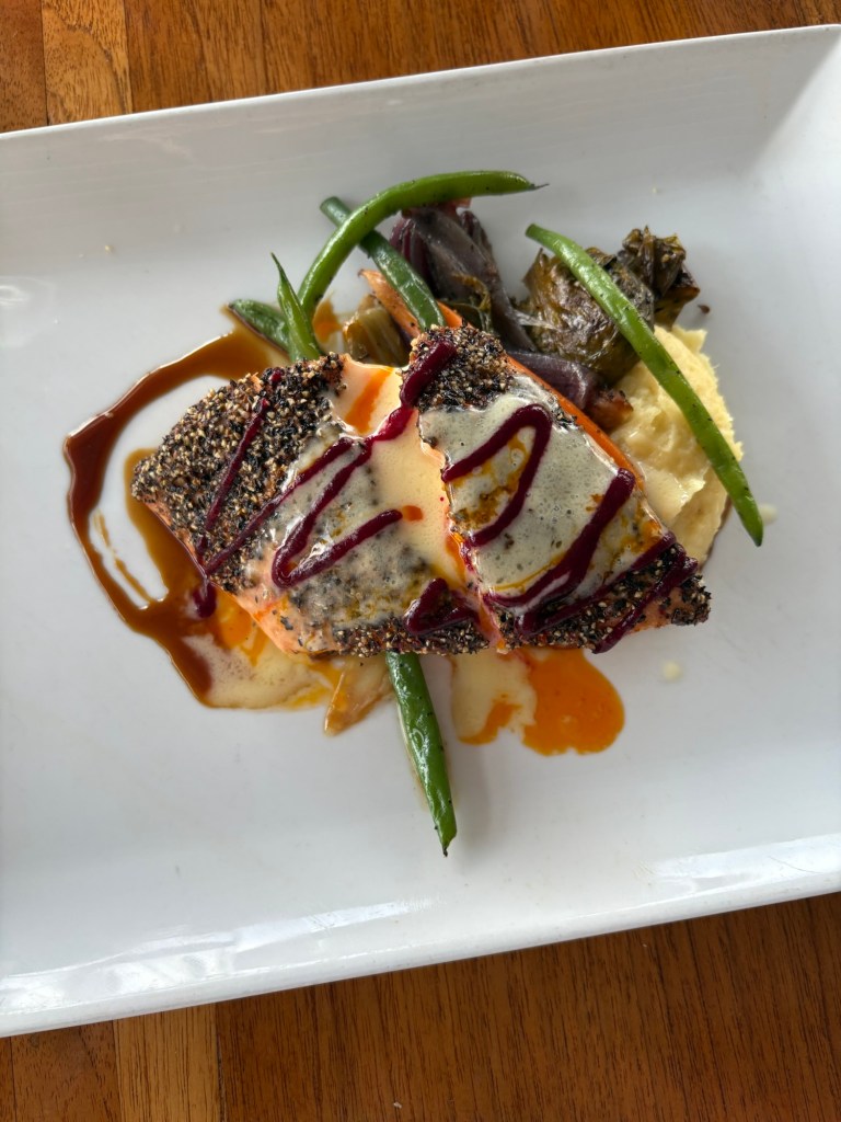 As this was our anniversary trip, I did insist on one dinner that was not ballpark food. For that one dinner, I made a reservation at Shore, which is located on Long Boat Key. Located right on the water, the views from the restaurant were breathtaking, but, dare I say, the food was even better. We started off with tuna tartare and a chicken chinois salad. For my main course, I went for the pepper-crusted salmon with pureed parsnips, roasted veggies, and a pomegranate glaze (picture below). This may have been the best salmon of my life. Husband ordered the branzino and had similarly positive things to say about it. Needless to say, if you find yourself in the area, I’d highly recommend making a reservation.